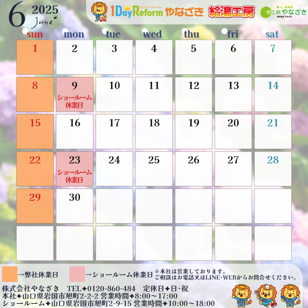 ※ショールーム休業日につきましては、本社は営業しておりますのでご相談等はお電話・LINE・WEBからお問合せください。