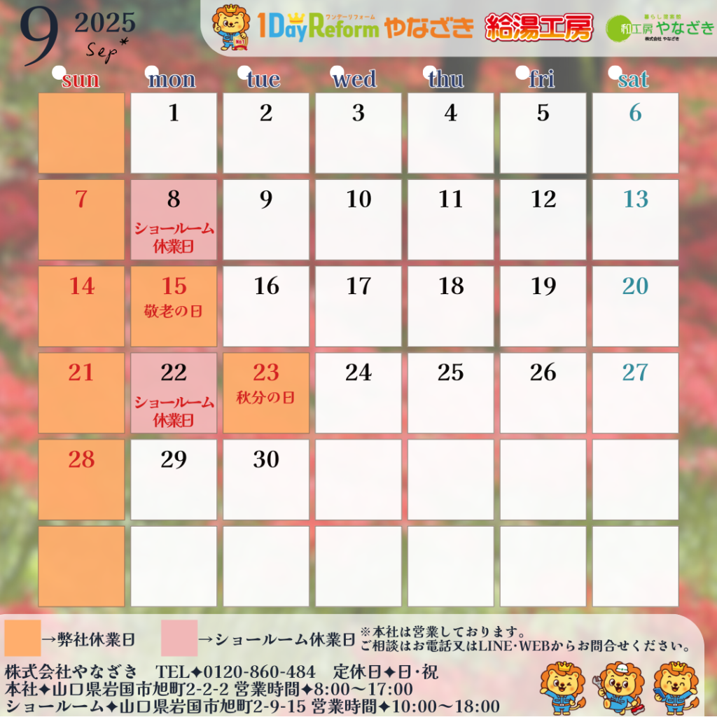 ※ショールーム休業日につきましては、本社は営業しておりますのでご相談等はお電話・LINE・WEBからお問合せください。
